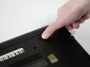 Нажмите два защёлкивающих язычка на задней стороне ноутбука внутрь, чтобы освободить аккумулятор.