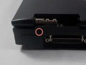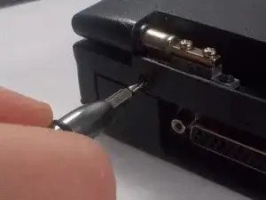 Удалите винт длиной 1 см крестовой отвёрткой Phillips #1, чтобы можно было отделить экран и верхнюю часть ноутбука от клавиатуры и нижней части.
