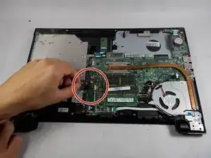 Отключите шлейф кнопки питания, отогнув белую пластиковую защёлку, которая соединяет его с материнской платой.
