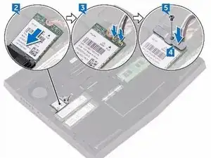 Удалите винт (M2x3), который фиксирует беспроводную карту и её кронштейн к корпусу компьютера.