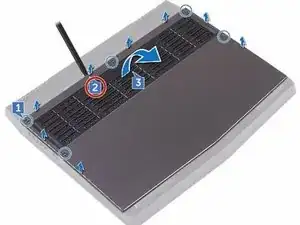 С помощью пластикового шила аккуратно подденьте крышку основания, чтобы освободить защёлки крышки основания из пазов на корпусе компьютера.
