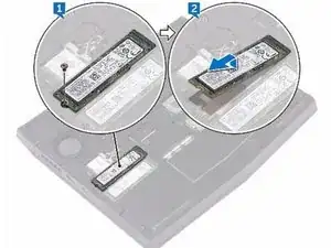 Удалите винт (M2x3), который фиксирует твердотельный накопитель к корпусу компьютера.