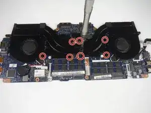 Удалите (7) винта с крестообразной головкой 3 мм, прикрепляющих сборку радиатора к системной плате, используя отвёртку Phillips #0.