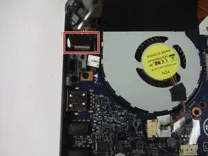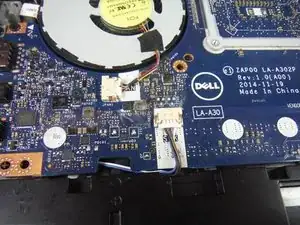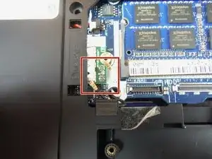 Поднимите защёлку коннектора и отключите кабель платы кнопки питания от системной платы. Кабель идентифицируется синим язычком.