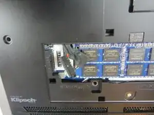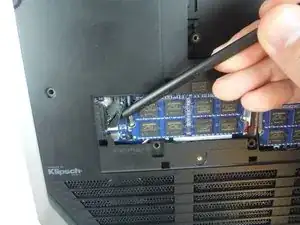 Удалите (2) винта с головкой Phillips 3 мм, используя отвертку Phillips #0, которые крепят сборку твердотельного накопителя к основанию компьютера.