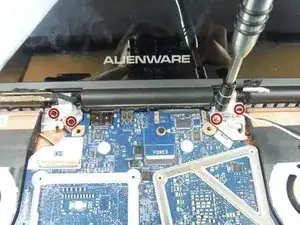 Удалите (2) винта с головкой Phillips 3 мм, используя отвертку Phillips #0, которые крепят крышки петель к петлям дисплея.