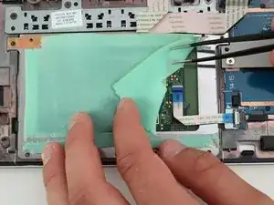 После снятия батареи станет видна нижняя сторона тачпада. Она покрыта защитным слоем пеноматериала мятного цвета.