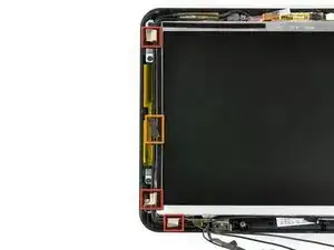В следующих шагах вы будете поддевать переднюю рамку дисплея, чтобы снять её с задней части дисплея. Места фиксаторов выделены красным.