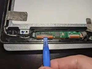 Плата сенсорного экрана закреплена на ободке двумя защёлками с дальней стороны и пластиковым крючком с ближней стороны.