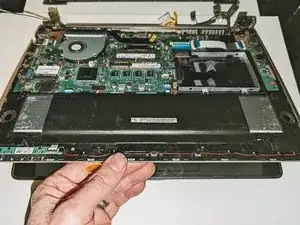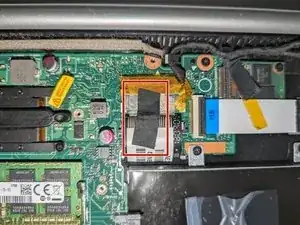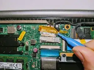 С помощью лопаточки поднимите разъём, соединяющий аккумулятор с материнской платой.