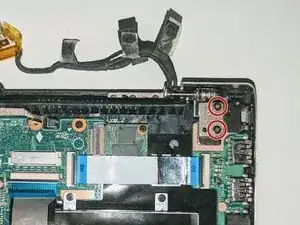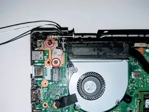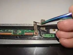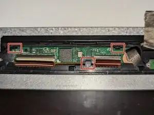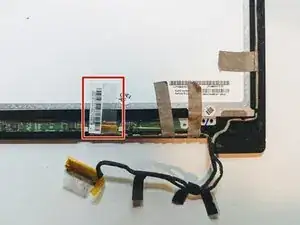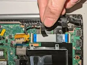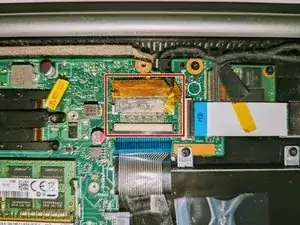 Отклейте три куска чёрной ленты, фиксирующие кабель дисплея к материнской плате.