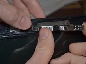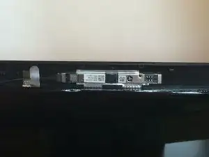Осторожно оттяните верхнюю часть корпуса монитора, оставив нижнюю часть прикреплённой, и найдите веб-камеру, подключённую проводом.