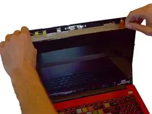 Снимите окантовку с верхней части монитора, используя лопатку для вскрытия из пластика, осторожно отщёлкнув защёлки по периметру.