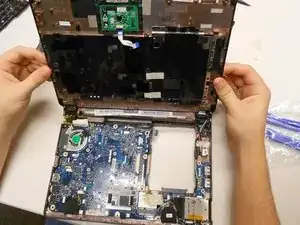 Аккуратно отсоедините ленточный кабель клавиатуры от материнской платы и снимите клавиатуру.