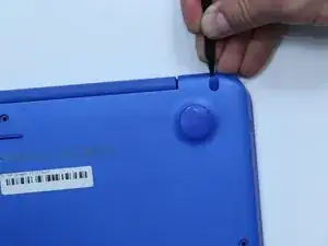Используйте пластиковую лопатку, чтобы снять две продолговатые заглушки винтов на нижней части компьютера.