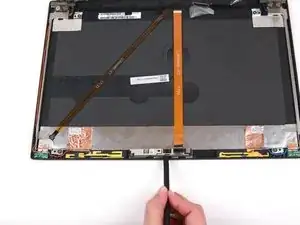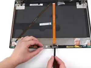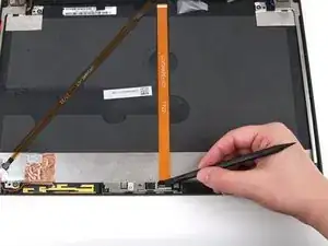 Продолжайте использовать инструмент для вскрытия iFixit вдоль левой стороны, низа и правой стороны ноутбука, чтобы отщёлкнуть защёлки, фиксирующие рамку к дисплею.