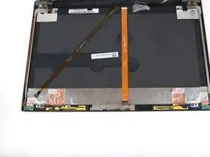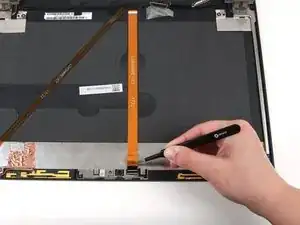 Возможен риск повреждения устройства: кабель дисплея всё ещё соединяет панель дисплея с остальной частью узла дисплея, поэтому переворачивайте панель аккуратно.