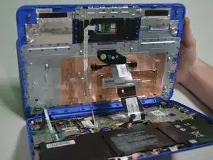 Осторожно приподнимите клавиатуру и определите три ленточных кабеля, соединяющих основную часть ноутбука с клавиатурой.