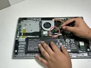С помощью пинцета отсоедините белый разъём вентилятора от гнезда на материнской плате.