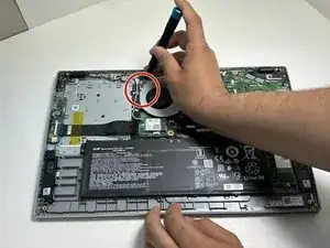 С помощью пинцета удалите чёрную ленту, фиксирующую кабель вентилятора.