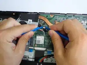 Отключите вентилятор от материнской платы, потянув за провод с помощью двух инструментов для открытия iFixit.