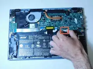 Осторожно отсоедините ленточный кабель, соединяющий аккумулятор и материнскую плату.
