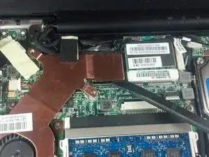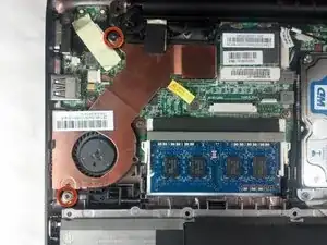 Используйте крестовую отвёртку №0, чтобы удалить два винта длиной 3,76 мм, крепящие узел вентилятора/радиатор к материнской плате.