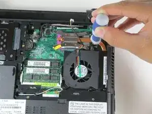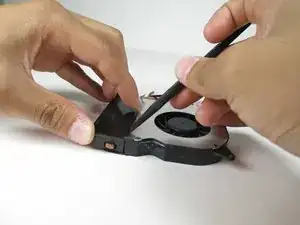 Используя плоский конец лопатки, осторожно подденьте клейкую ленту, прикрепляющую вентилятор к стороне ноутбука.