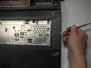 Найдите 5 защёлок в верхней части клавиатуры. Вставьте металлическую лопатку в отверстия защёлок на клавиатуре, чтобы снять клавиатуру.