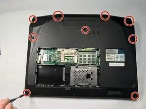 С помощью отвертки PH0 выкрутите девять винтов 4 мм на нижней части ноутбука.