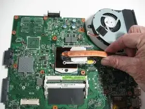 Отсоедините вентилятор от материнской платы. Вентилятор приклеен тонким слоем термопасты, для ослабления адгезии потребуется лопатка.