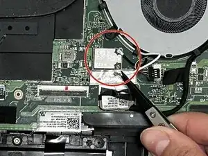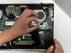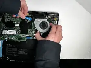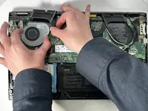 Аккуратно поднимите радиатор вверх, используя инструмент для открытия Ifixit или пальцы, и вытащите вентилятор из-под радиатора.