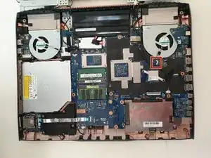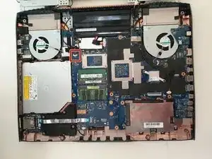 Отвинтите и снимите три винта 5.8 мм на небольшой плате справа от правого вентилятора крестовой отверткой Phillips #00.
