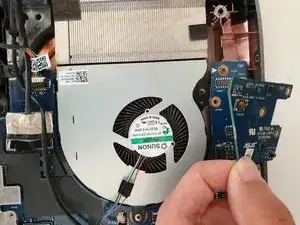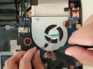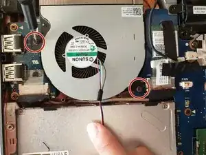 Используя отвертку Phillips #00, отвинтите два винта длиной 5,8 мм, которые фиксируют левый вентилятор на материнской плате.