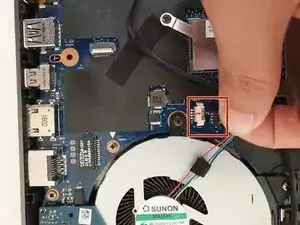 Осторожно отщёлкните кабель левого вентилятора от материнской платы.