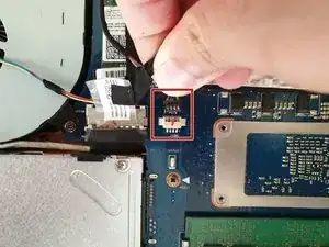 Отключите кабель батареи от разъёма на материнской плате, аккуратно потянув его влево от разъёма.
