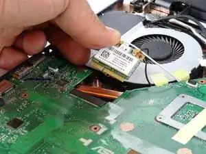 Выньте модуль Wi‑Fi из-под радиатора охлаждения, приподняв край, ближайший к вентилятору, и сдвинув его в сторону вентилятора.