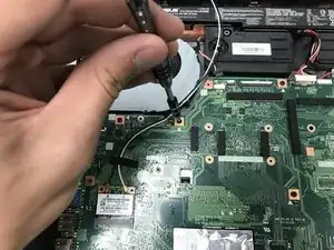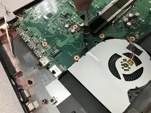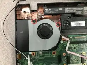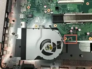 Удалите винт с крестовым шлицем #00, который крепит вентилятор к материнской плате.