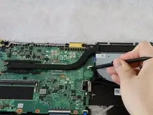 Поскольку батарея и вентилятор ЦП закреплены одним винтом, для замены неисправного вентилятора ЦП необходимо снять оба компонента. Уделите особое внимание правильному отключению трудно доступного кабеля, который проходит вдоль боковой части вентилятора ЦП.