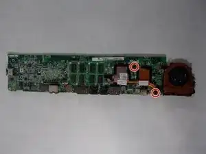 Используя крестовую отвертку Phillips #0, выкрутите два винта 2 мм, крепящих вентилятор к материнской плате.
