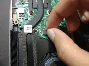 Поднимая вентилятор, отключите его от ноутбука, схватив соединитель (обведенный в красный круг) и потянув его горизонтально.