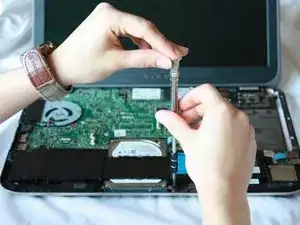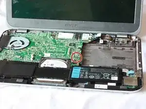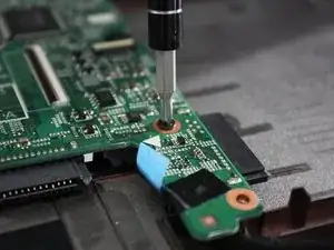 С помощью отвертки с наконечником J0 выверните винт с крестообразным шлицем длиной 6 мм, расположенный в центре ноутбука на материнской плате.