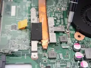 С помощью отвертки с наконечником J0 выверните три винта с крестообразным шлицем длиной 5 мм, крепящие вентилятор к материнской плате.