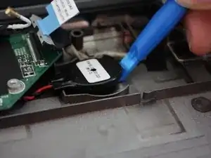 С помощью пластиковой монтажной лопатки аккуратно отсоедините таблеточную батарейку от поролонного клея.