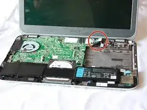 Подденьте маленький чёрный фиксатор у основания шлейфа лопаткой, чтобы освободить шлейф от компьютера.