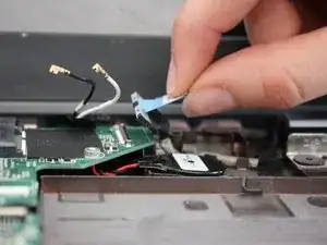 Осторожно отсоедините чёрный и белый провода от мини‑карты беспроводной связи.