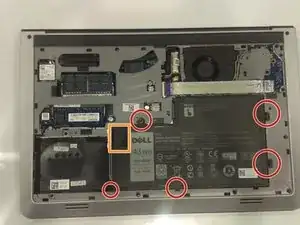 Используйте отвертку Phillips J0 для снятия винтов, указанных маркерами на изображении. Всего 5 винтов. Будьте осторожны, чтобы не повредить аккумулятор.