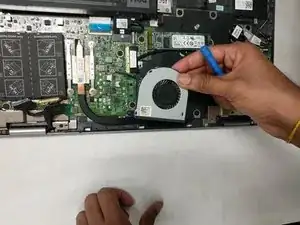 Используйте пластиковый инструмент для открытия, чтобы снять соединитель, который крепит вентилятор к материнской плате.