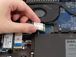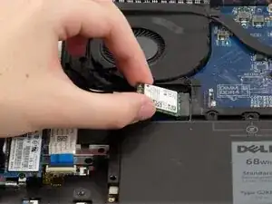 Осторожно выдвиньте карту WWAN с задней стороны, от конца, где были антенны и скоба.
