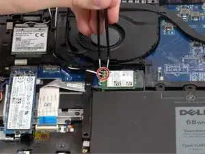 Снимите винт 4 мм, удерживающий скобу над картой WWAN, с помощью отвертки Phillips #0.